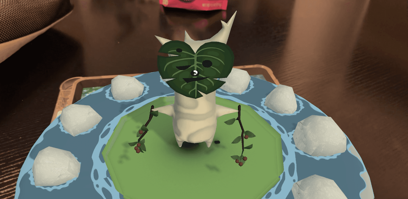 An AR course project using Vuforia image targeting to trigger an animated forest-spirit scene. When the tracked image is detected, a small character jumps out, and a tap interaction plays a distinctive audio reaction.